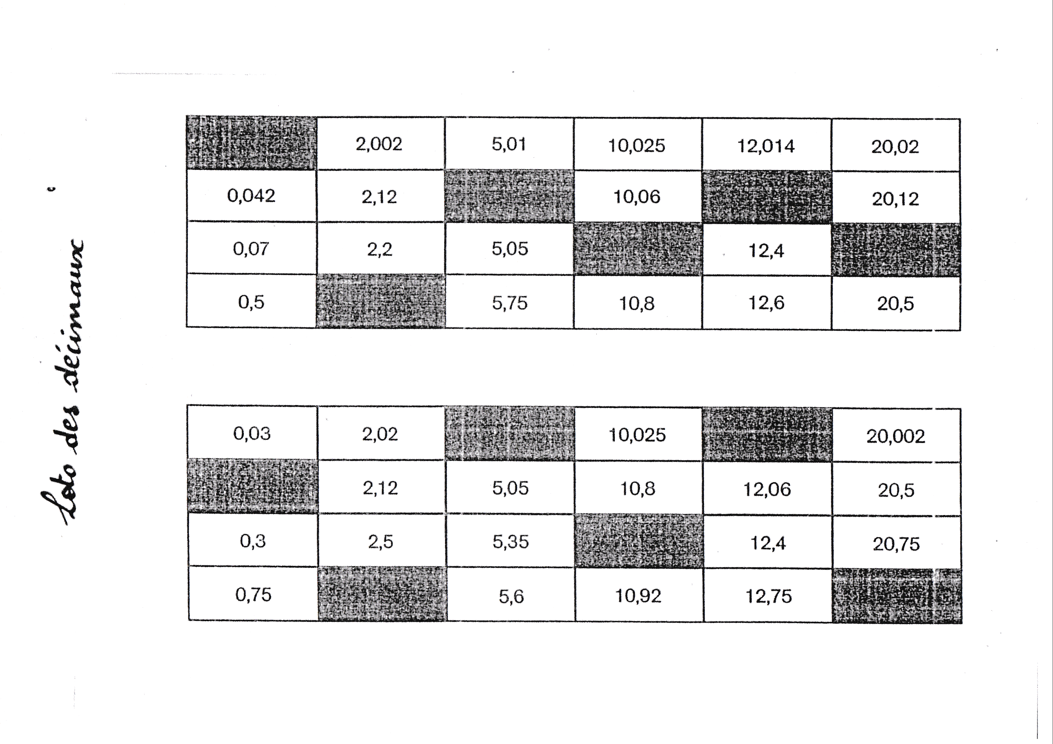 Règle du jeu. Afin de jouer Imprime la grille de loto pour autant de joueur nécessaire mais tu peux aussi jouer seul. Procures toi des pions , jetons , pois-chiches , lentilles pour couvrir les grilles. Génère un nombre aléatoire pour couvrir la grille (note-le pour la vérification) Le premier à recouvrir la grille ou une quine crie" ICI" Une quine c'est une ligne entière d’une grille. On vérifie qu’il n’y a pas d’erreur. Cela s’appelle faire le décompte. En cas d’erreur le joueur fautif doit vider sa grille. On dit démarquer. Le dessin du fond d’écran est fait par une élève de la classe 1CVE L.E.P. Mermoz de Béziers.